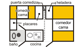puertas, corredizas que separan el ambiente y brindan mayor privacidad, 3 placares (uno con abertura para heladera), alacena y bajomeasda de melanina con pileta y anafe de 2 hornallas, todo en acero, bomba eléctrica 12V automática, tanque de agua 95L, colchonetas, cortinas en todas las ventanas, heladera a 220V y calefón de 6L con corte automático.