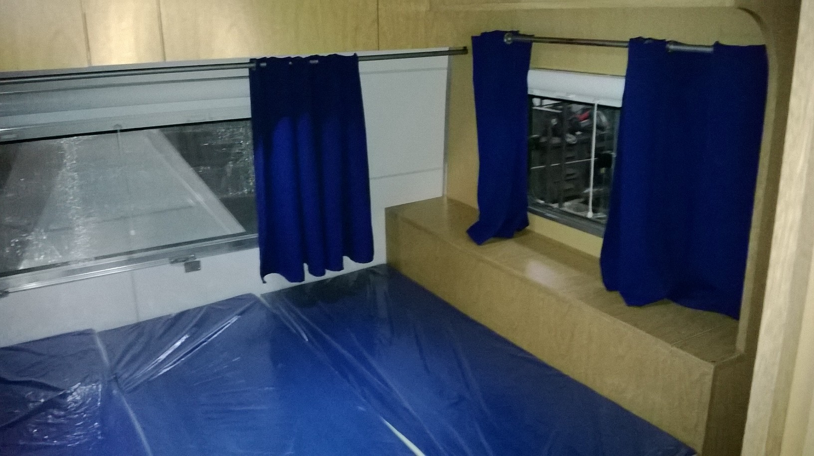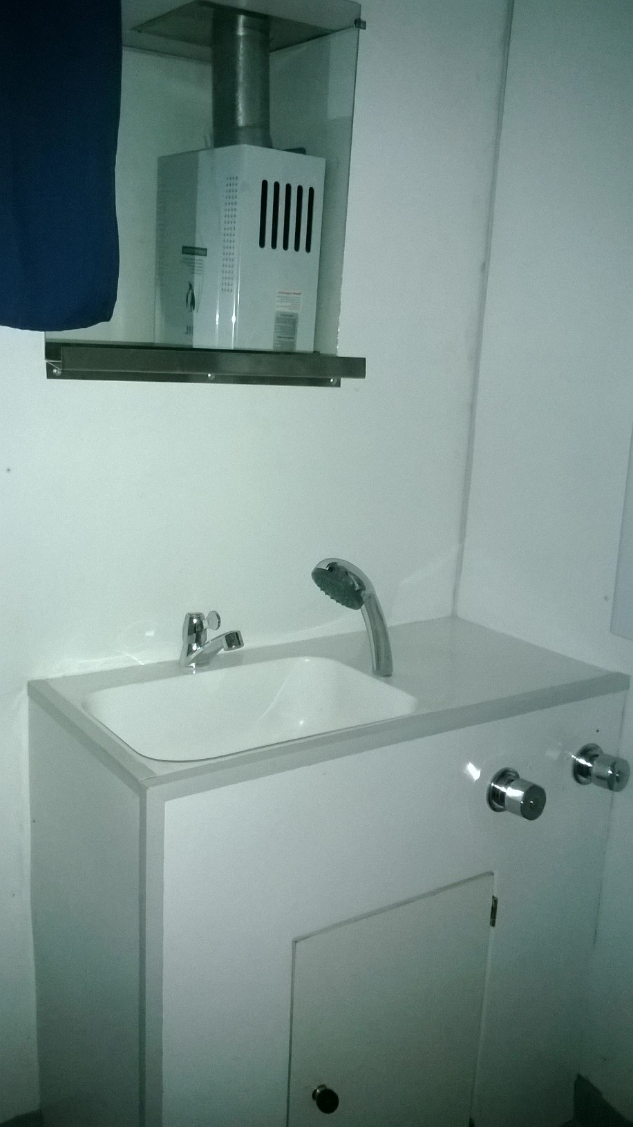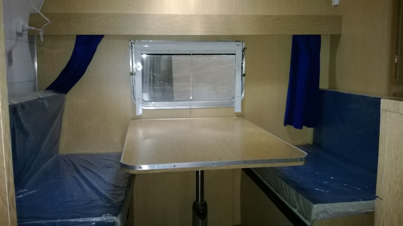 Revestida con chapadur plus (tipo corlock) en pared y techo. Piso revestido vinílico. Placard con abertura para heladera. Mesa hecha en caño tubular de 20x20 revestida con terciado de 4mm y fórmica, su borde cubierto con bagueta de aluminio.