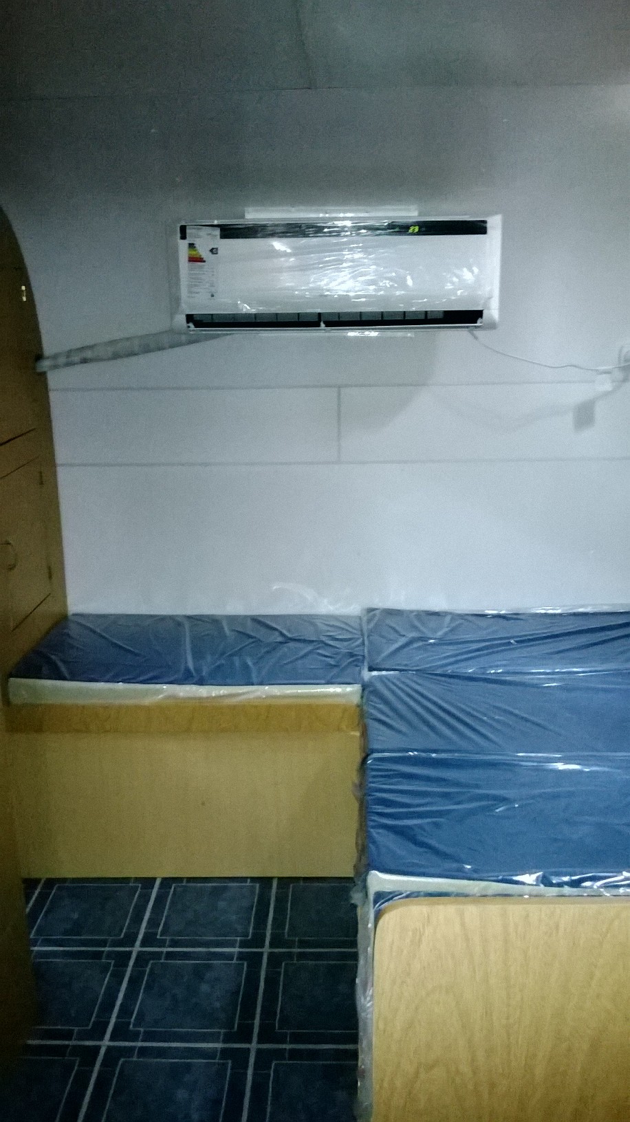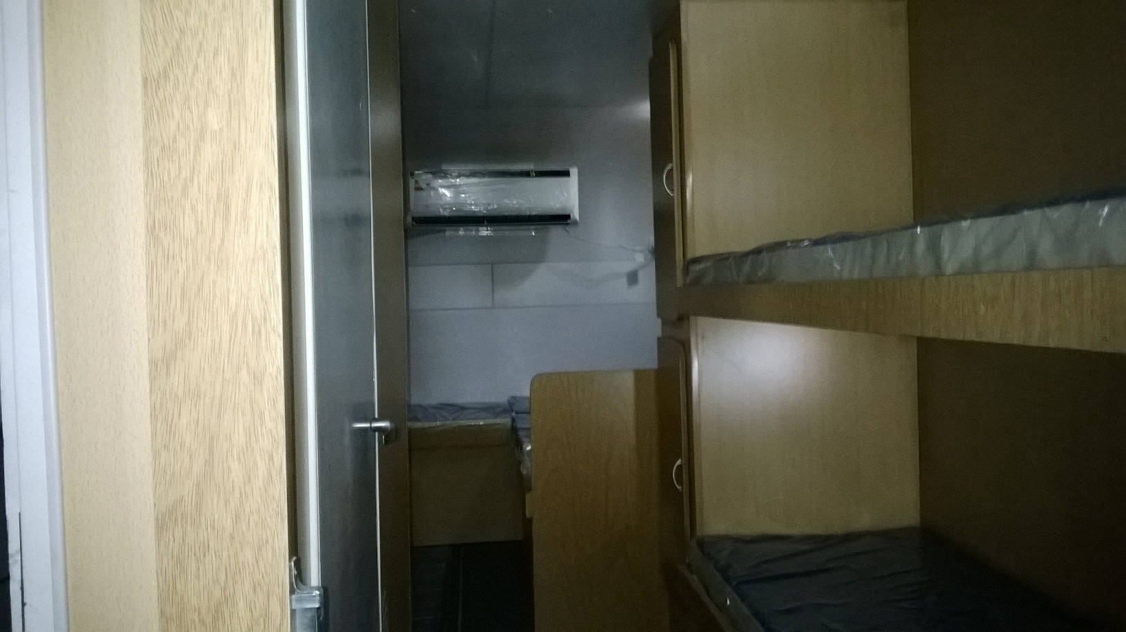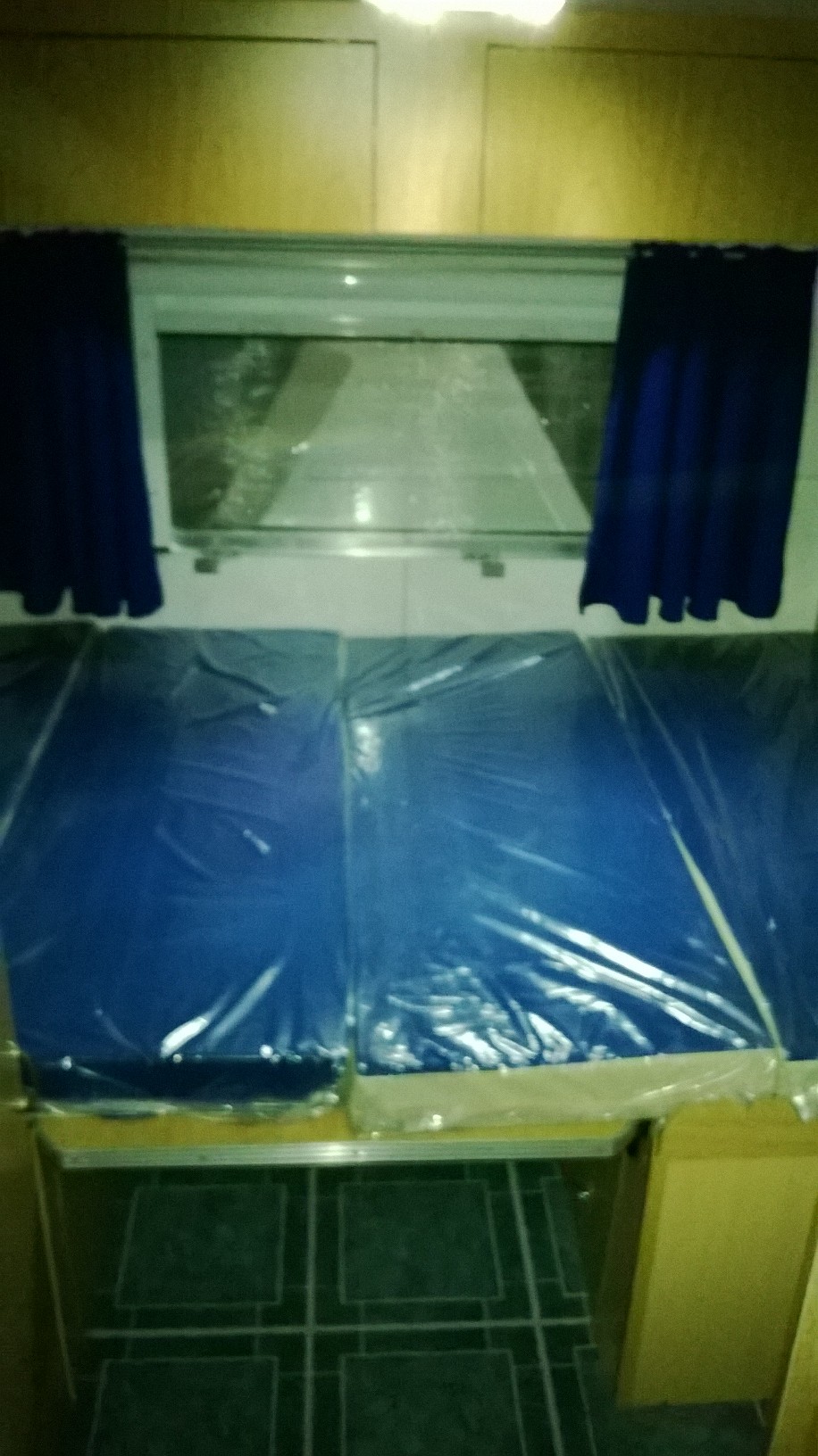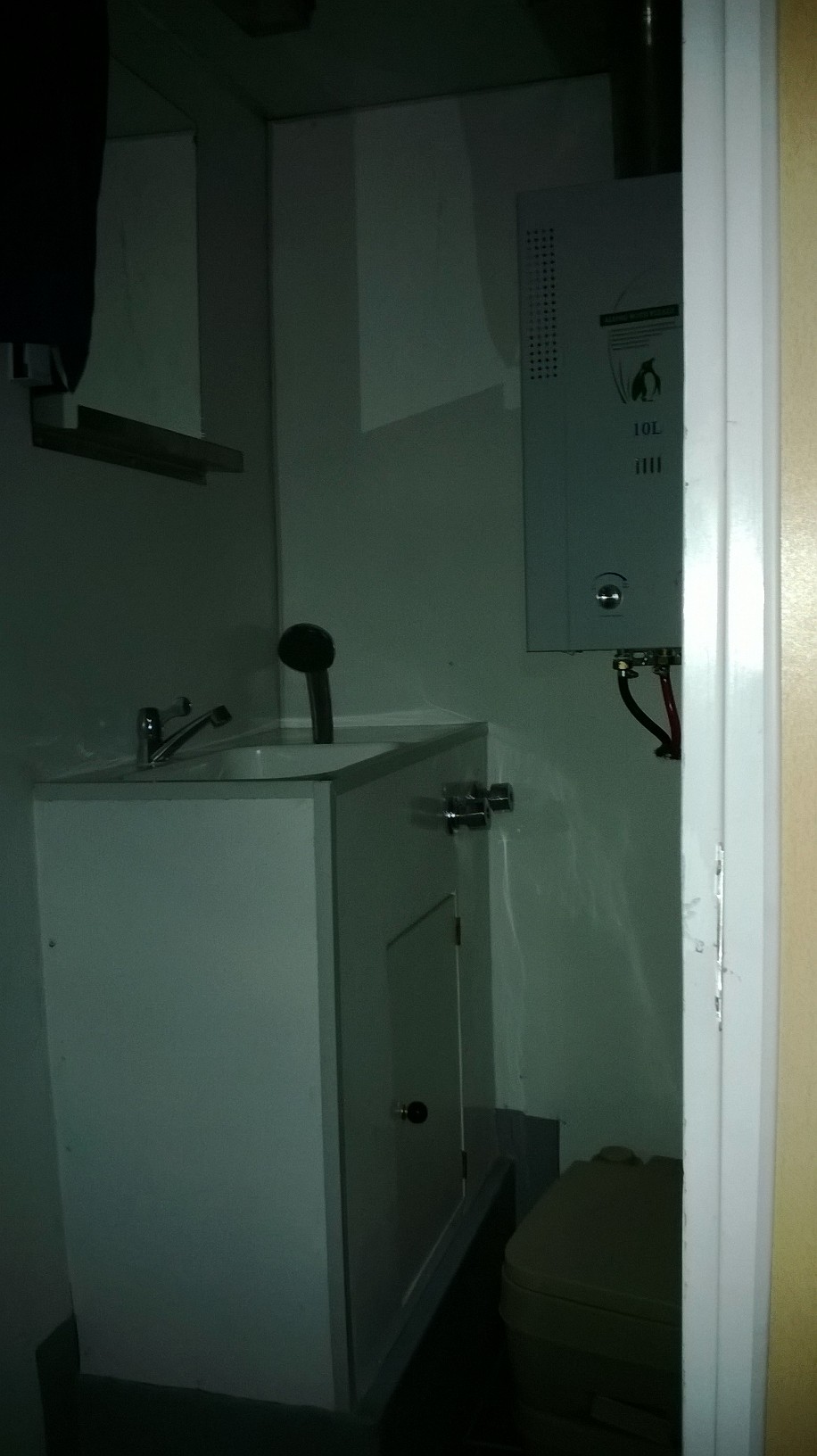 Revestida con chapadur plus (tipo corlock) en pared y techo. Piso revestido vinílico. Placard con abertura para heladera. Mesa hecha en caño tubular de 20x20 revestida con terciado de 4mm y fórmica, su borde cubierto con bagueta de aluminio.