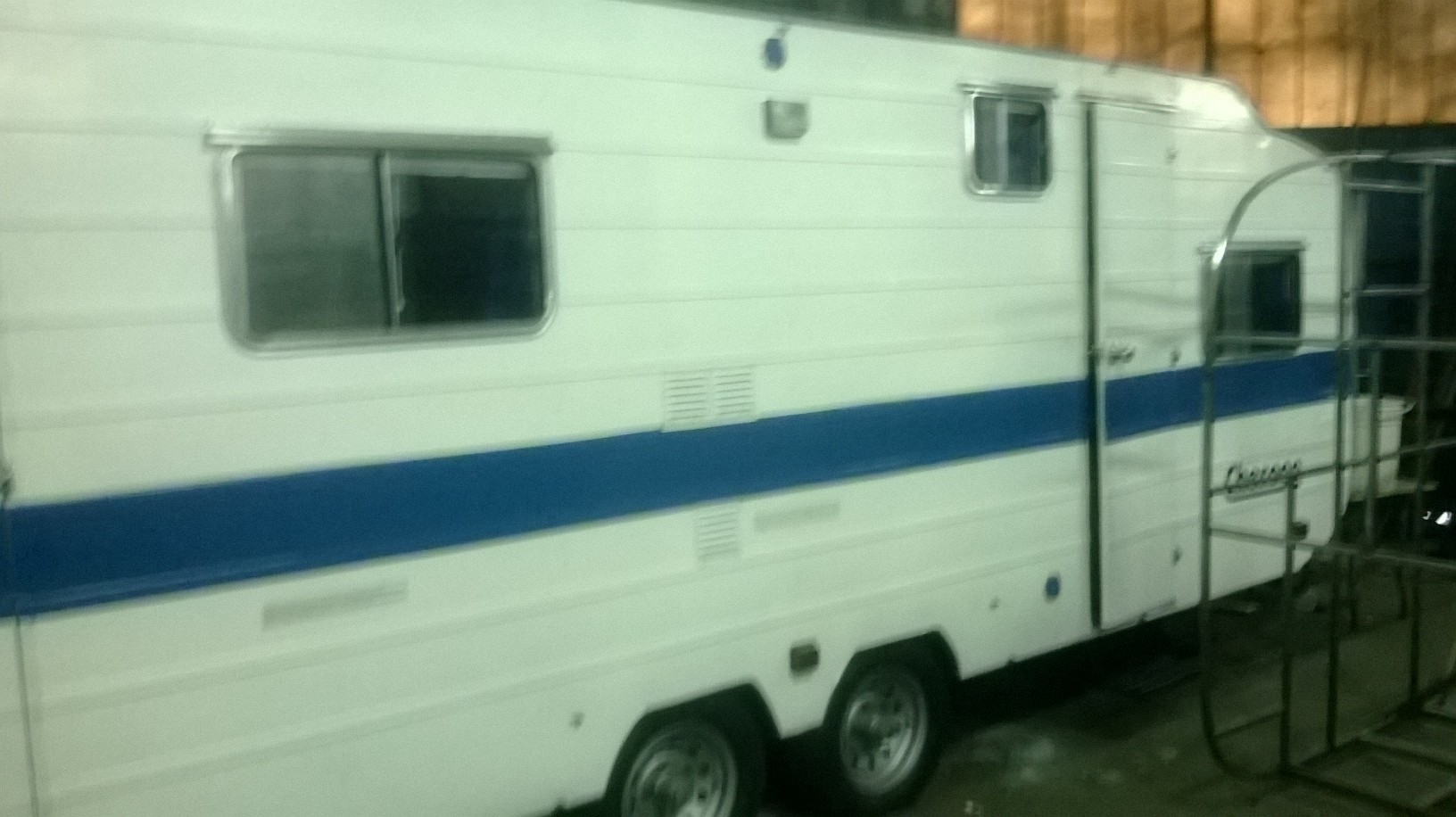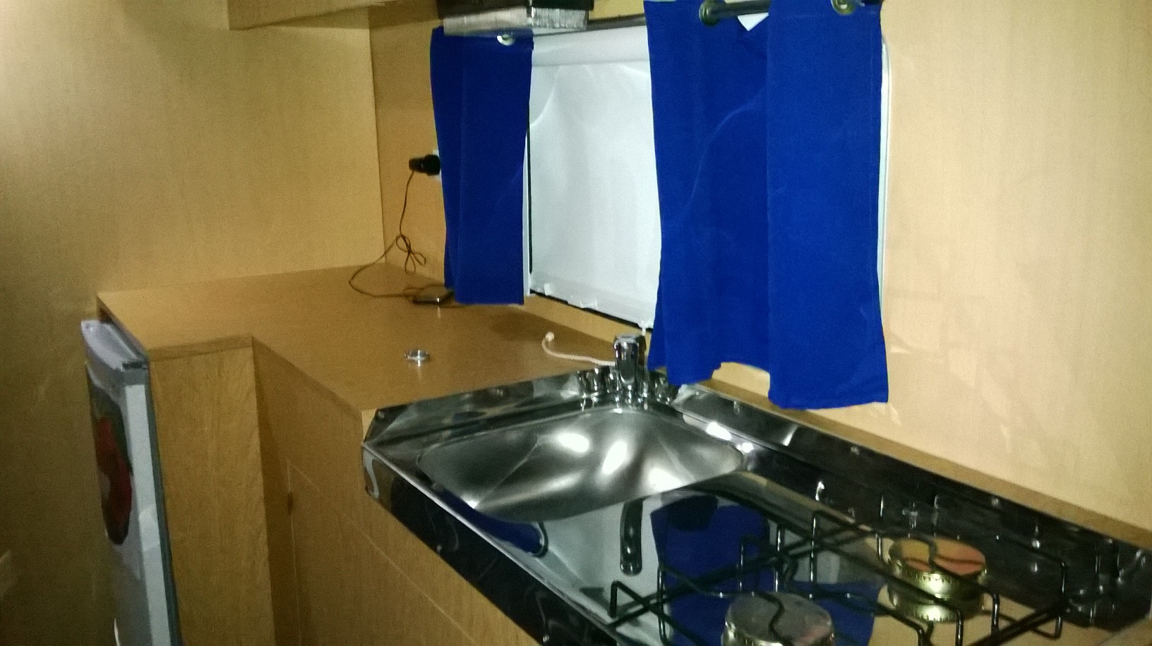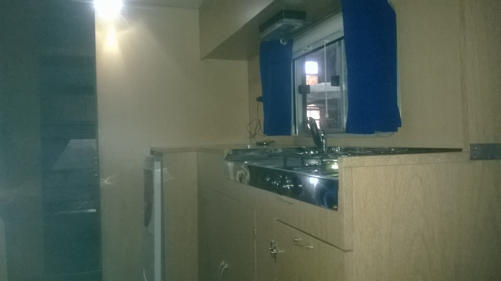 Alacena, bajomesada y muebles en melanina, pileta de acero con mesada imitación mármol, canilla monocomando, heladera 220V, cocina con horno, bomba eléctrica automática 12V, tanque de agua de 95L, colchonetas, calefón de 6L con corte automático.