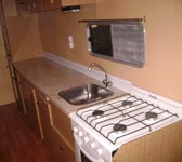 Revestida con chapadur plus (tipo corlock) en pared y techo. Piso revestido vinílico. Amoblamiento en melamina, amplio comedor, mesada de fórmica con pileta de acero inoxidable, grifería en bronce cromado. Cocina con horno y 4 hornallas, bajomesada.
